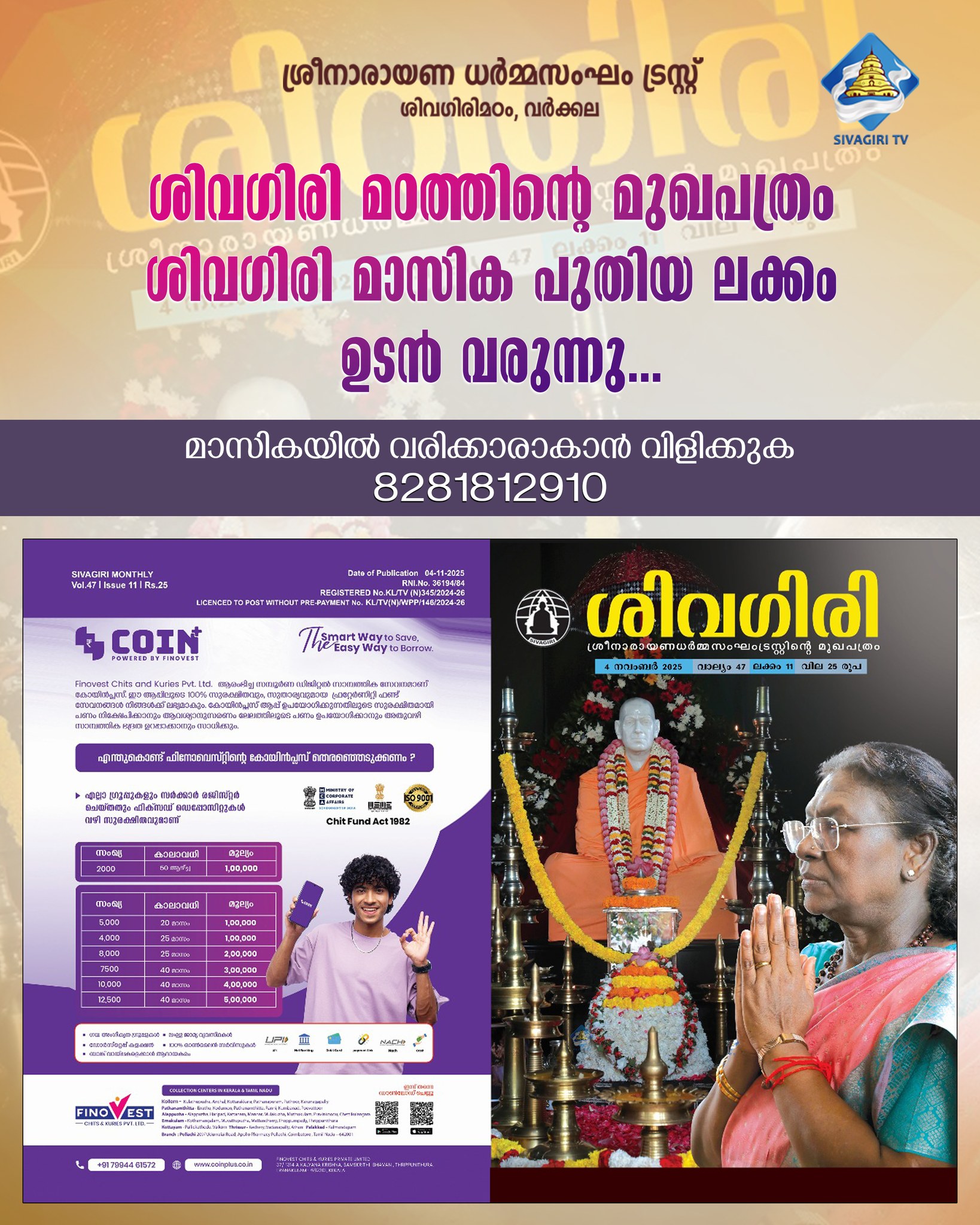 ഭാരതത്തിൻ്റെ പ്രഥമ പൗരയുടെ ശിവഗിരി സന്ദർശനവും, ഓസ്ട്രേലിയയിലെ വിക്ടോറിയൻ പാർലമെന്റിൽ നടന്ന സർവമത സമ്മേളന ശതാബ്ദി സമ്മേളനവും വിശേഷപതിപ്പിൽ പുതിയ ലക്കം ഉടൻ പുറത്തിറങ്ങുന്നു...