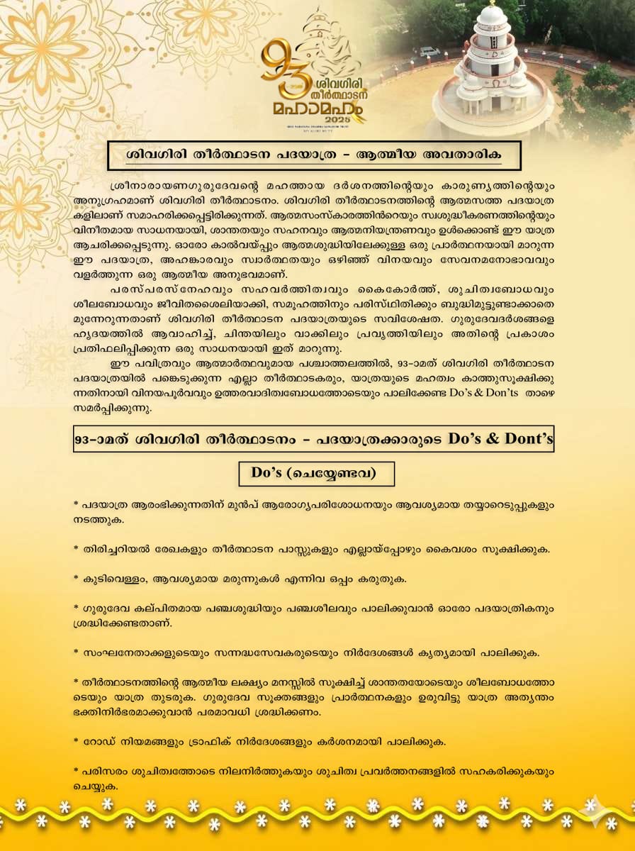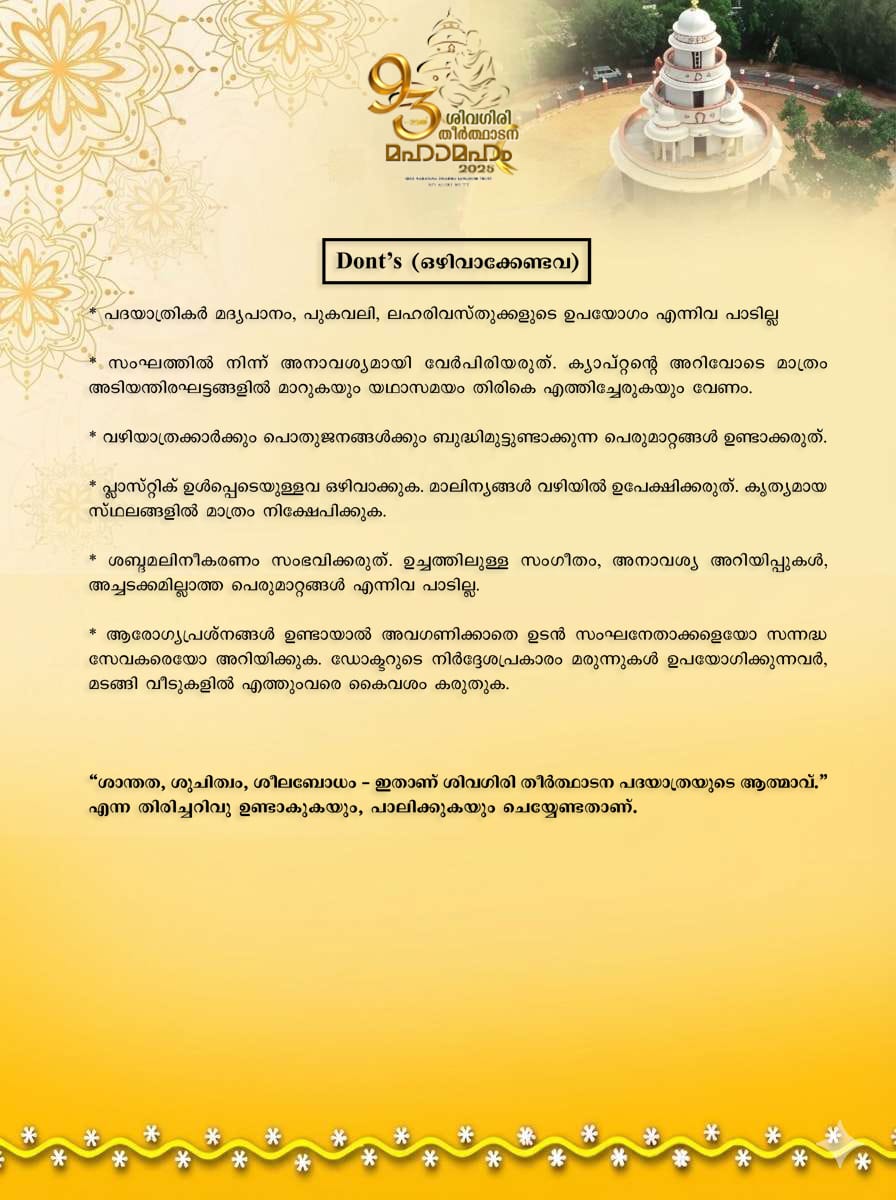 ഈ പവിത്രവും ആത്മാര്ത്ഥവുമായ പശ്ചാത്തലത്തില്, 93-ാമത് ശിവഗിരി തീര്ത്ഥാടന പദയാത്രയില് പങ്കെടുക്കുന്ന എല്ലാ തീര്ത്ഥാടകരും, യാത്രയുടെ മഹത്വം കാത്തുസൂക്ഷിക്കുന്നതിനായി വിനയപൂര്വവും ഉത്തരവാദിത്വബോധത്തോടെയും പാലിക്കേണ്ട Do’s & Don’ts താഴെ സമര്പ്പിക്കുന്നു.