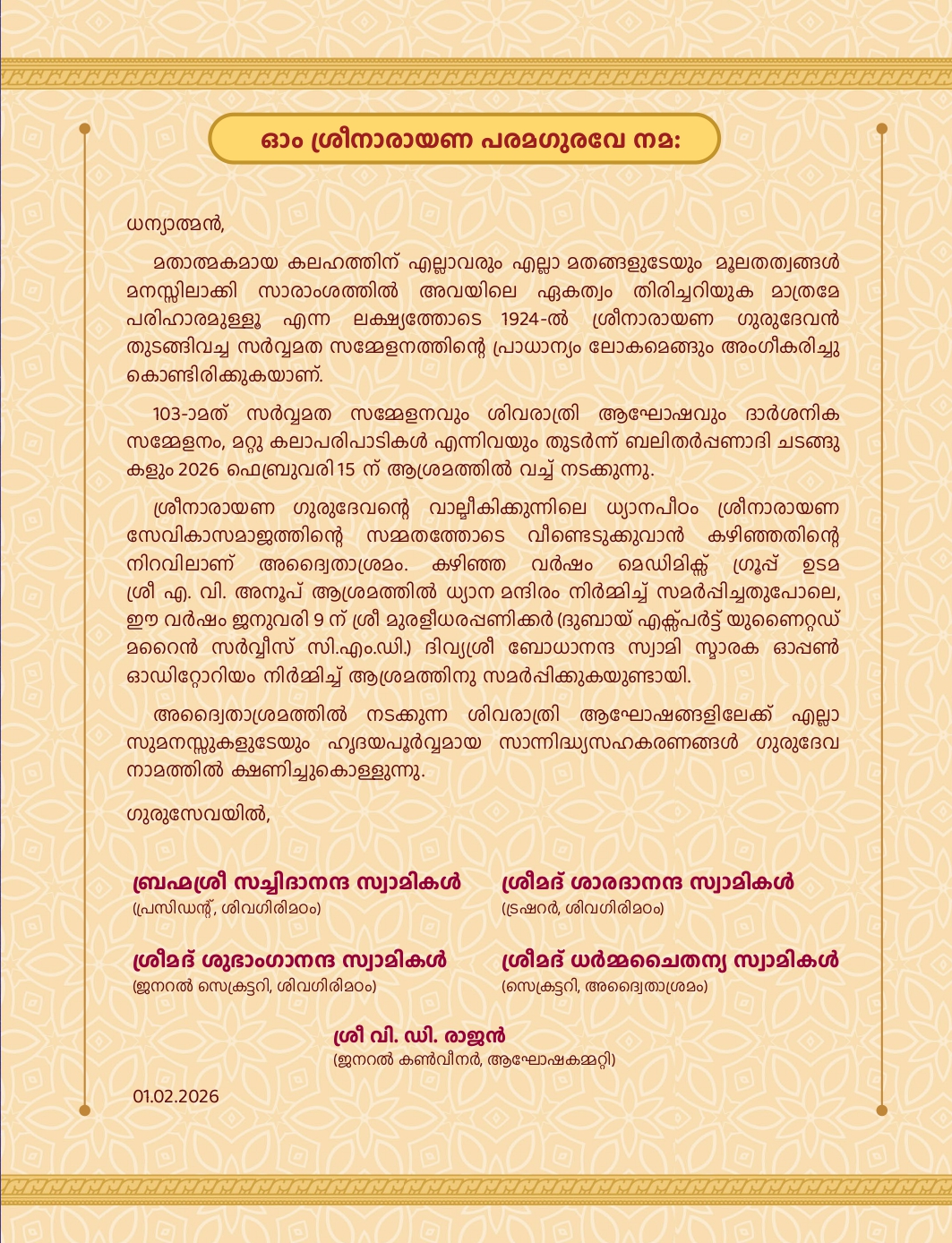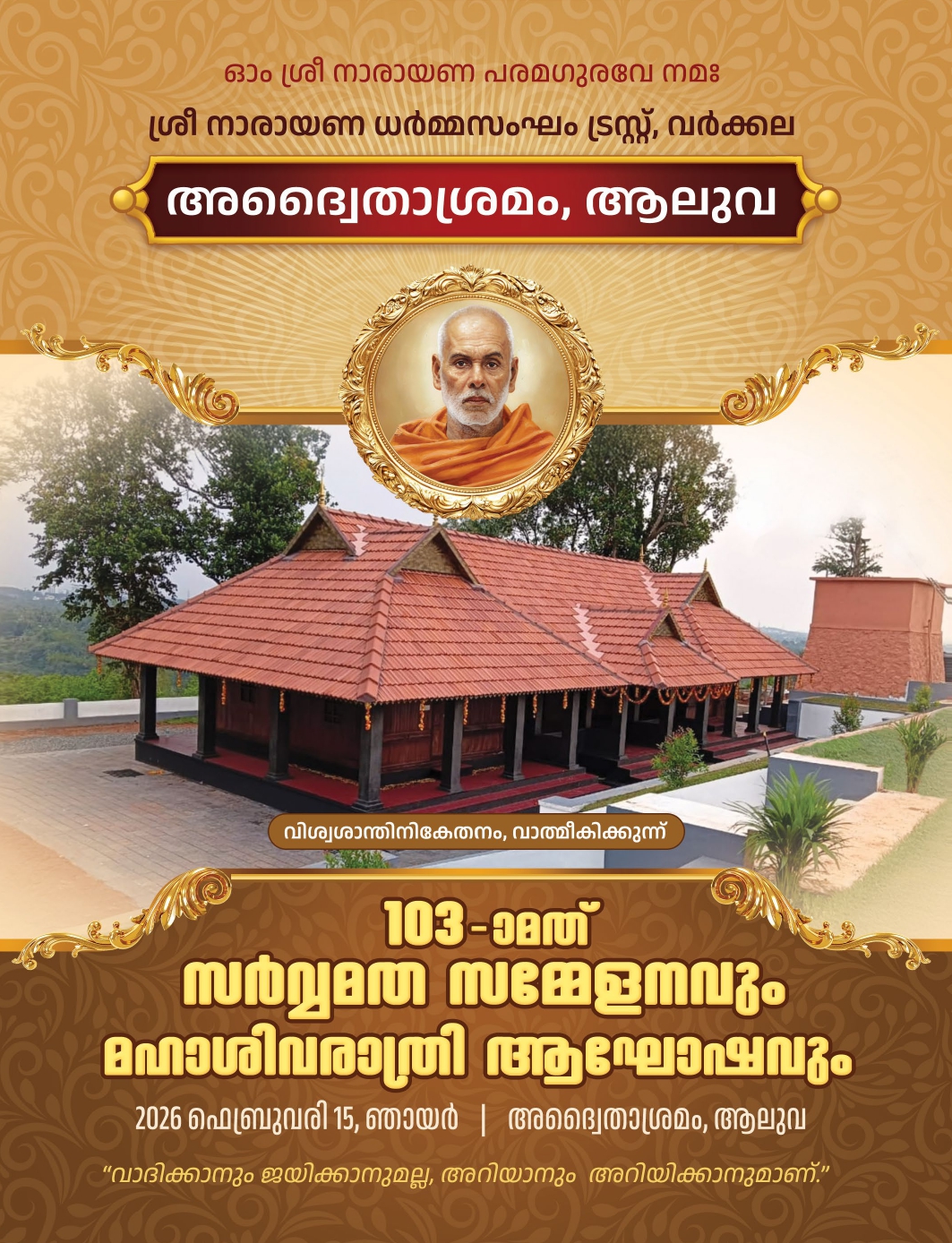ആലുവ അദ്വൈതാശ്രമത്തിൽ 103-മത് സർവ്വമത സമ്മേളനവും, മഹാശിവരാത്രി ആഘോഷവും 2026 ഫെബ്രുവരി 15 ഞായറാഴ്ച